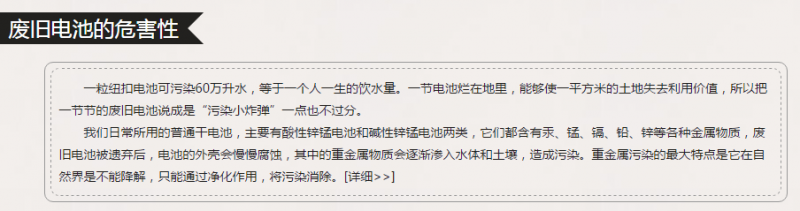 電池是我們?nèi)粘I钪凶顬槌R?jiàn)的一種的生活物品。電池如果不能持續(xù)供電,就變成了廢電池。很多人覺(jué)得廢電池和日常產(chǎn)生的垃圾一樣,沒(méi)電了就隨意扔在垃圾桶中,但是長(zhǎng)期下去,廢電池可以對(duì)環(huán)境造成不可估量的危害。環(huán)保專家提醒大家:廢電池不可隨意丟棄。