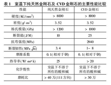 化學氣相沉積(CVD)金剛石是純金剛石的多晶結構,沒有金屬結合劑成分,理論上講它是最接近天然金剛石的一種新型刀具材料,其性能與PCD接近(或略低于PCD),而成本遠比PCD低,且可在復雜形狀上獲得均勻涂層。CVD金剛石的主要性能及其與純天然金剛石的性能比較見下圖。