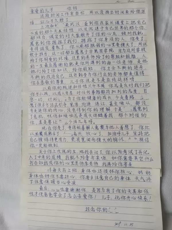 上次和爸爸來武漢,看到你在家長課堂上把自己從前那個天真任性以及沉迷于自己世界的那個你都坦白,誠實的對大家敞開了你的心底,頓時,我就感覺到你擁抱了我們,擁抱了你身邊的人,你變了,變得誠實勇敢了,你從前那個脆弱的心理變強大了,所以敢于擔(dān)當,這一切都應(yīng)該感謝宇凰國學(xué)院,因為這所學(xué)校給了你轉(zhuǎn)變的環(huán)境,這里的老師給了你幫助和鼓勵,人的一生最應(yīng)該感謝的就是你所遇到的每一位老師,是他們給了你知識、給你鼓勵,你才會不斷的改進自己,這些勤勞為你付出的老師都是值得你去恭敬的、尊重的,兒子你說是不是應(yīng)該這樣呀。