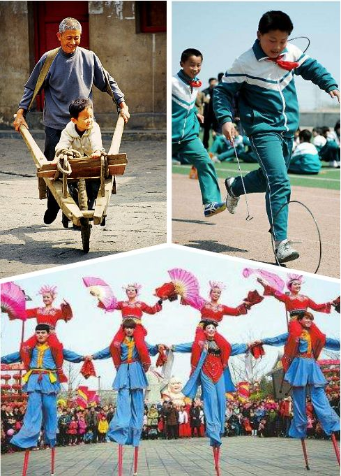 踩高蹺、滾鐵環(huán)、轉(zhuǎn)風(fēng)車