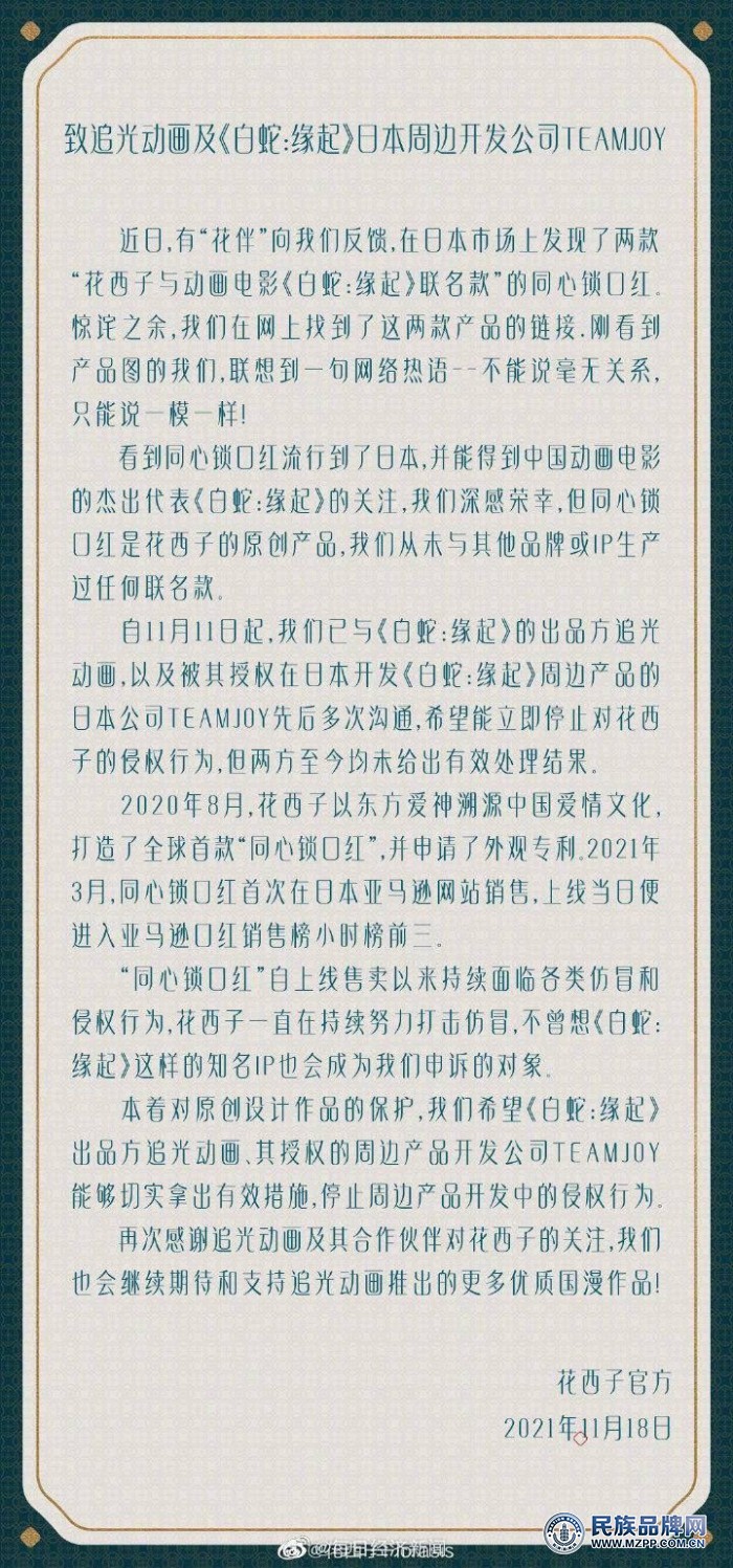 華在《致追光動(dòng)畫及日本周邊開發(fā)公司TEAMJOY》聲明中指出,近日有《花伴》反饋,“華與動(dòng)畫電影(《白蛇:緣起》)”兩款同心鎖口紅在日本市場被發(fā)現(xiàn)。華在網(wǎng)上找到了這兩款產(chǎn)品的鏈接,說:“不能說跟它沒關(guān)系,只能說是一模一樣!”