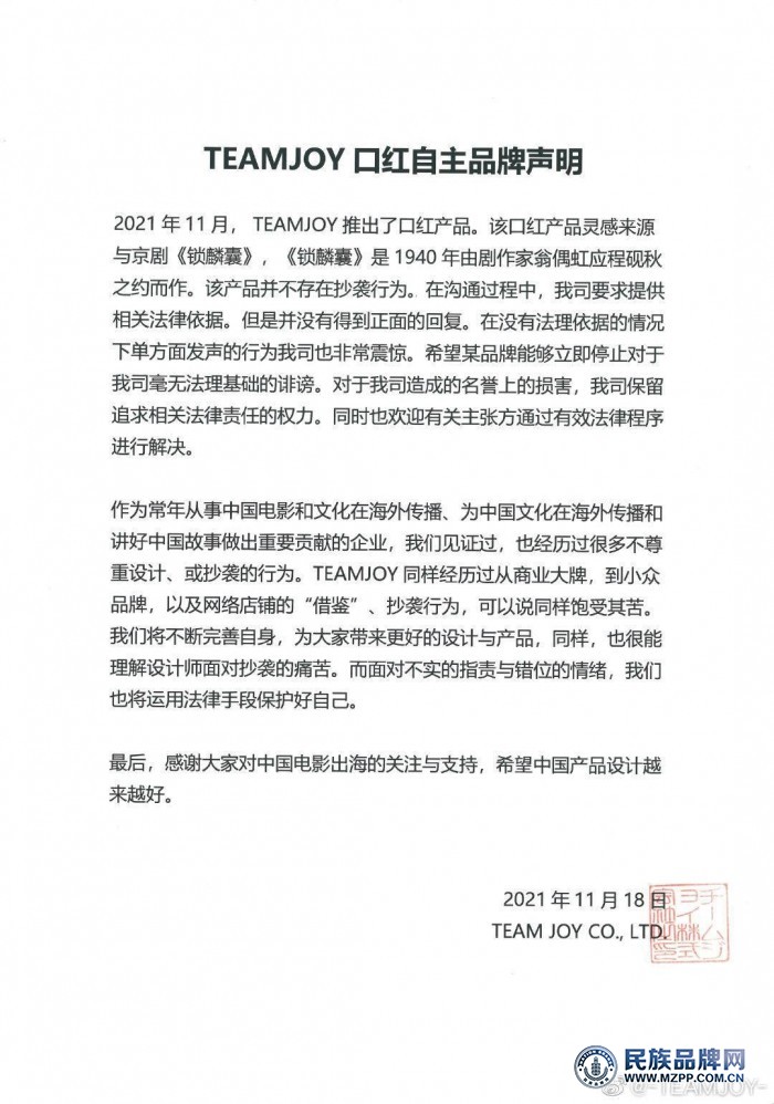 11月18日晚,針對(duì)華聲稱【0x9A8B】周邊產(chǎn)品涉嫌抄襲一事,IP開發(fā)公司TEAMJOY在社交平臺(tái)@華Florasis上發(fā)布聲明稱,2021年11月,TEAMJOY推出了一款口紅產(chǎn)品,“這款口紅產(chǎn)品的靈感來源于京劇【0x9A8B】,由劇作家翁歐虹于1940年應(yīng)程之邀創(chuàng)作。這款產(chǎn)品沒有抄襲。”