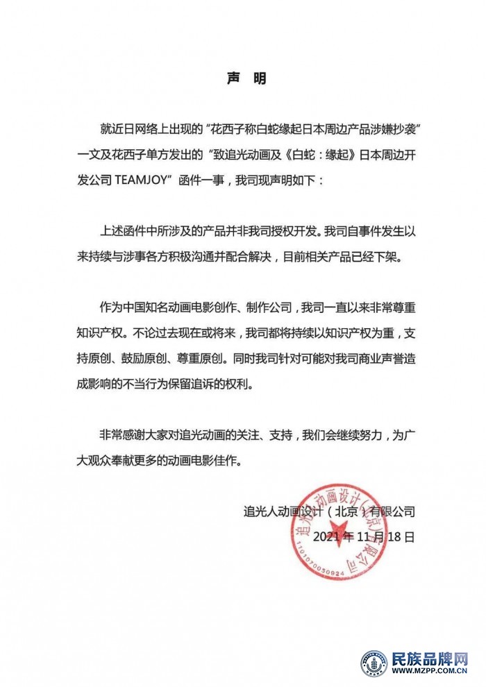 同時(shí)聲稱已多次與《白蛇:緣起》的制作方諸光動(dòng)畫、其授權(quán)在日本開發(fā)《白蛇:緣起》周邊產(chǎn)品的日本公司TEAMJOY溝通,希望立即停止對(duì)華西子的侵權(quán)行為,但至今雙方均未給出有效結(jié)果。