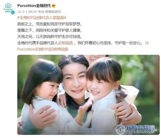 當(dāng)天,棉花時代官方微博發(fā)布了代言人的大幅廣告圖片。影片講述了郭晶晶角色轉(zhuǎn)換的心路歷程,對孩子的身心教育,以及對環(huán)保事業(yè)的投入。郭晶晶溫柔從容的生活態(tài)度,讓大家感受到她與自己、與家人、與自然的相處之道,守護著每一份愛與安心。