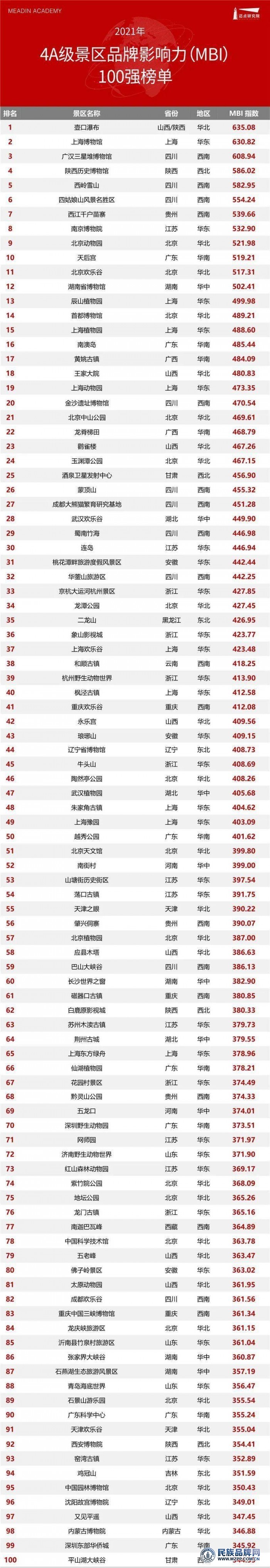 以下是麥點研究院獨家發(fā)布的“2021年4A級景區(qū)品牌百強榜”。壺口瀑布、上海博物館、廣漢三星堆博物館位列年度榜單前三,陜西歷史博物館、西陵雪山、四姑娘山景區(qū)、西江千戶苗寨、南京博物館、北京動物園、天后宮位列榜單前十。