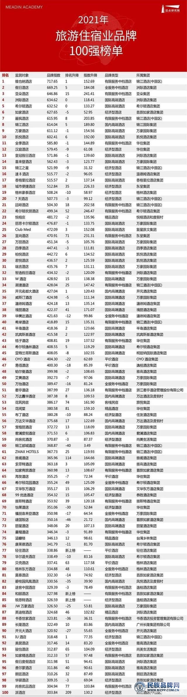 麥點研究院獨家發(fā)布了“2021年旅游住宿行業(yè)品牌100強”,其中排名前十的品牌分別是維也納酒店、假日酒店、亞朵酒店、洲際酒店、希爾頓酒店、如家酒店、莫礪鋒酒店、錦江酒店、萬豪酒店、凱悅酒店。