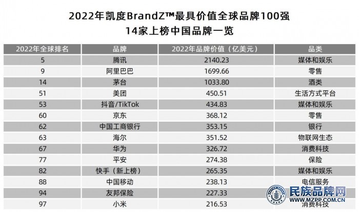 在百年未有之變局、全球疫情反復等諸多因素影響下,中國品牌的表現(xiàn)依然強勁。共有14個品牌進入該榜單,成為上榜企業(yè)數(shù)量第二多的國家。