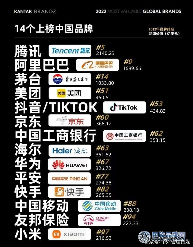 推動(dòng)品牌商業(yè)增長(zhǎng)的能力取決于消費(fèi)者對(duì)它的看法。與其他品牌價(jià)值排行榜不同的是,BrandZ是唯一包含消費(fèi)者意見(jiàn)的品牌價(jià)值排行榜。消費(fèi)者的日常購(gòu)買決策會(huì)影響品牌在榜單中的位置。自1998年以來(lái),凱度在全球51個(gè)市場(chǎng)調(diào)查了超過(guò)400萬(wàn)消費(fèi)者,涉及19000個(gè)品牌。換句話說(shuō),榜單上的品牌其實(shí)都是消費(fèi)者用腳投票的。在凱度“2022年BrandZ全球最具價(jià)值品牌100強(qiáng)”榜單中,我們可以發(fā)現(xiàn),盡管面臨疫情的反復(fù)挑戰(zhàn),中國(guó)品牌依然堅(jiān)韌。共有14家中國(guó)公司上榜,顯示了強(qiáng)大的品牌實(shí)力。