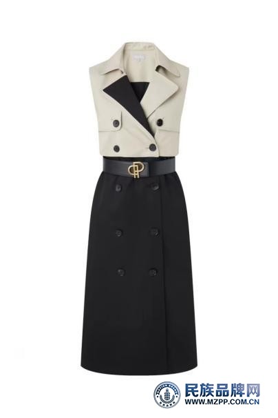 上駝色下黑色的撞色設(shè)計(jì)為服裝增添了時(shí)尚感。此外,寬腰帶設(shè)計(jì)可以修飾體型,同時(shí)也可以塑造女性的黃金比例,改善腰線,達(dá)到顯高顯瘦的效果。