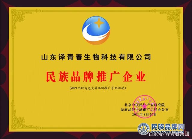 近日,山東譯青春生物科技股份有限公司榮獲“民族品牌提升企業(yè)”,由北京中聯(lián)民族產(chǎn)業(yè)研究院授予。作為優(yōu)秀的民族品牌,譯清春相關(guān)宣傳展示將于2021年在納斯達(dá)克大屏推廣?! ∑放菩枰⒑屯茝V。近年來,中國優(yōu)秀民族企業(yè)和民族品牌的影響力不斷擴(kuò)大,走向世界,對打造世界知名的中國民族企業(yè)品牌,進(jìn)一步提高中國整
